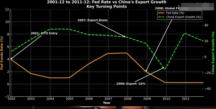 当2005年美联储重启加息周期,美元流动性开始逆转,中国外贸增速随即见顶回落,直至2008年金融危机跌至谷底。