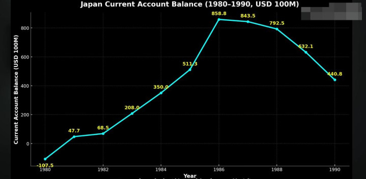 这一时期,日本对美出口总额翻倍,较1975年更是增长四倍,经常账户顺差从1980年的-105亿美元飙升至1986-1988年间的800多亿美元巅峰,这一纪录直到2005年中国在新一轮美元宽松周期中才被打破。